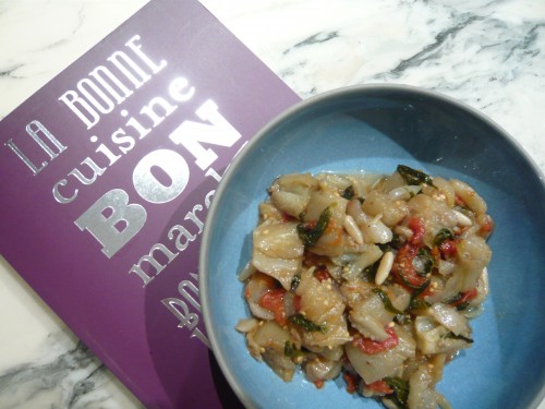 Pour celles qui me restaient, j’ai eu l’idée de consulter un livre qui est pour l’instant peu sorti de ma bibliothèque, pour des raisons mystérieuses : « La bonne cuisine bon marché bonne pour la santé » de Gérard Vives. J’ai pensé à lui car il est classé par aliment, ce qui pouvait être un gain de temps. J’ai donc trouvé un tagine d’aubergines confites fort appétissant pour lequel il me semblait avoir tous les ingrédients (oignon, ail, tomates, pignons, basilic, persil, miel). Mais je découvre, un peu tard, qu’il me manque le ras-el-hanout, que je croyais avoir dans mon étagère à épices. Pas de panique, passons d’un continent à l’autre, je m’empare du Garam Masala, conçu par la paire Beena-Roellinger, en me disant qu’il fera sûrement bon ménage avec des aubergines (Beena, j’espère que tu ne m’en voudras pas de cet usage fantaisiste ;-)) Le tout mijote et embaume. Résultat : une assiette moelleuse et ultra-parfumée.