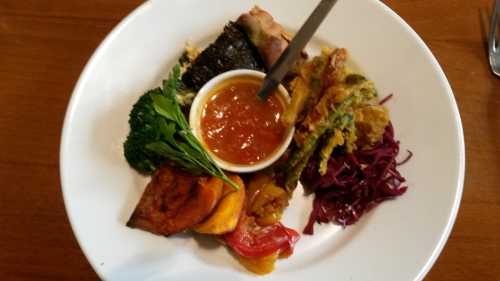 – une assiette maraîchère composée de légumes crus et cuits, que j’ai choisi : c’était un assortiment délicieux de légumes crus, cuits, frits, en quiche…. tous excellents.