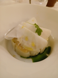 Eh bien, pour éviter que mon amie « s’ennuie », elle lui apporte la même entrée que moi, en miniature. Comme c’est gentil et attentionné ! Par ailleurs un pur délice (entrée de poireau, tourteau et sarrasin).