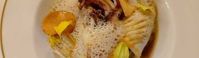 Je suis tentée par deux entrées, mon amie par la suggestion du jour, du pigeonneau. Je propose qu’on m’apporte les deux entrées en même temps que son plat mais la dame trouve ça inadapté car ce plat prend 25 mn de préparation : trop d’attente. Donc, allons-y pour le poireau en solo et ensuite ma deuxième entrée, l’encornet en même temps que le pigeonneau.