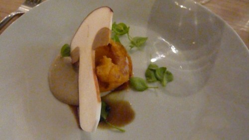 – « tarte fine à l’oignon doux de Provence, pralin », une belle entrée en matière avec une douceur sucrée-salée,